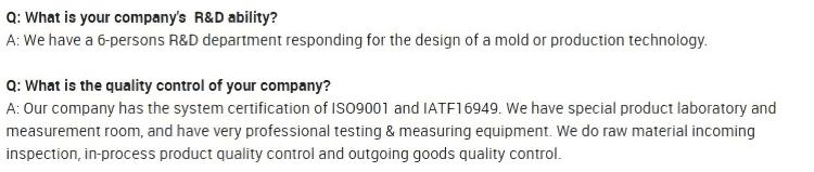 SGS၊ ROHS၊ IATF16949:2016 သို့မဟုတ် ဖောက်သည်၏လိုအပ်ချက်အရ ပြင်ပအဖွဲ့အစည်း စစ်ဆေးခြင်း |